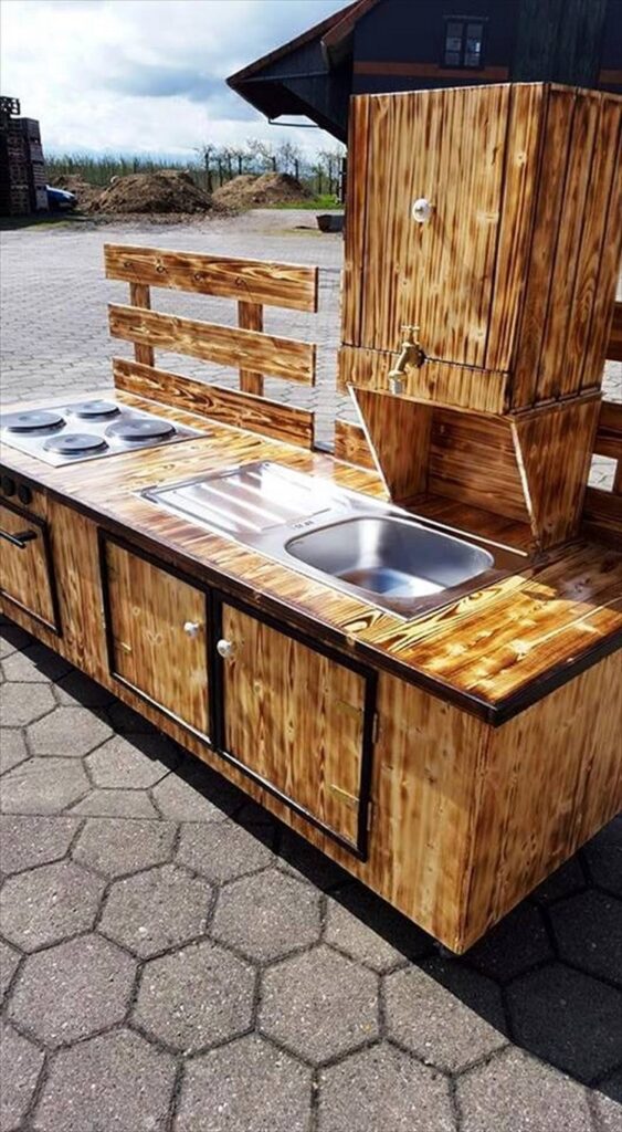 This kitchen is placed on a timber created floor created out of pallets to give a traditional attraction. You can also place some pallet seats and table for cuisine objective. An oven stand is kept on one side for planning the entire kitchen. Wooden pallet outdoor kitchen is a tremendous thing to do but it becomes great when built outside to enjoy your food preparation encounters. Creating this service near your garden does not require much persistence when done with pallets. Pallets are cut and joined up with together to make racks and units after cleaning them properly.